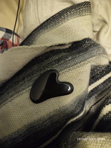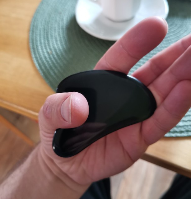 This is a very nice guasha stone. It is quite round and quite thick. It would be nice if it came in a box, but overall it’s highly recommended.