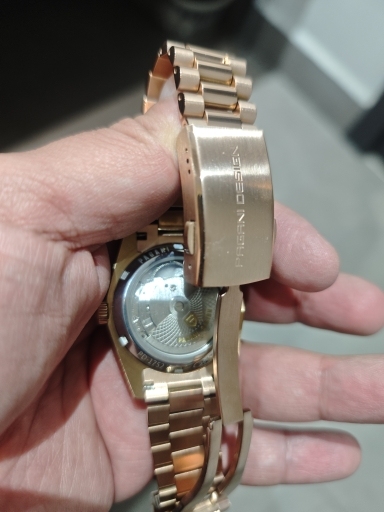 like all the brand’s watches, a very beautiful piece. This combination with the greenish-blue background looks spectacular. The crown is threaded and the clasp of the extender feels very sturdy and easy to use. Recommend the seller as well, the item was shipped almost immediately after purchase.