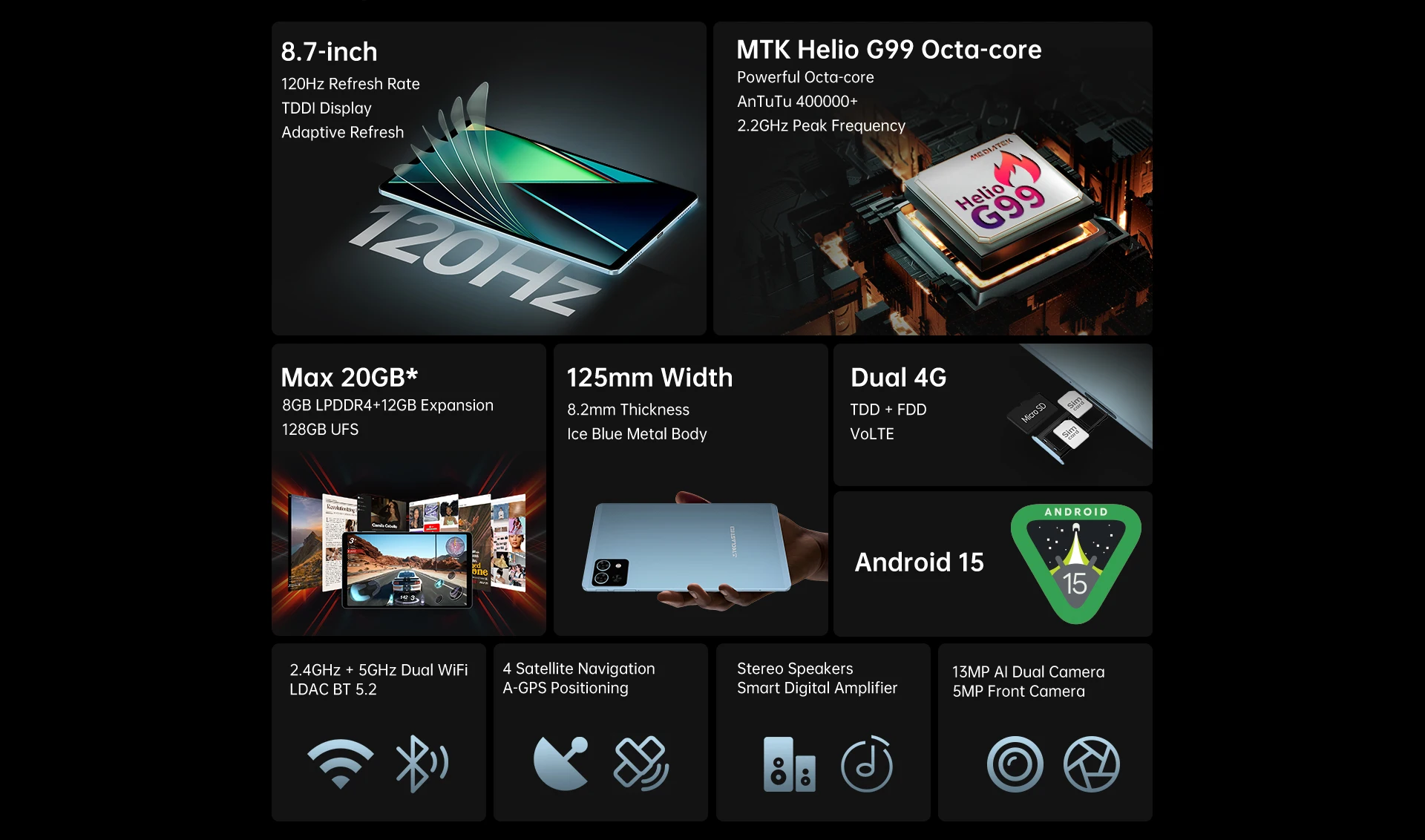 Teclast T50 Mini Tablet 8.7″ 120Hz Display MTK Helio G99 20 GB RAM (8+12 Virtual) 128GB ROM Android15 Tablets Support 4G Dual SIM